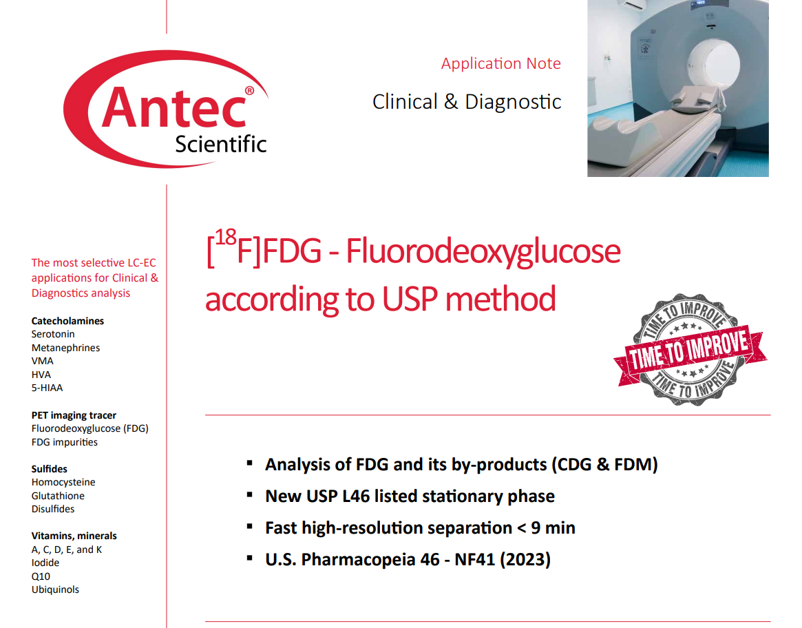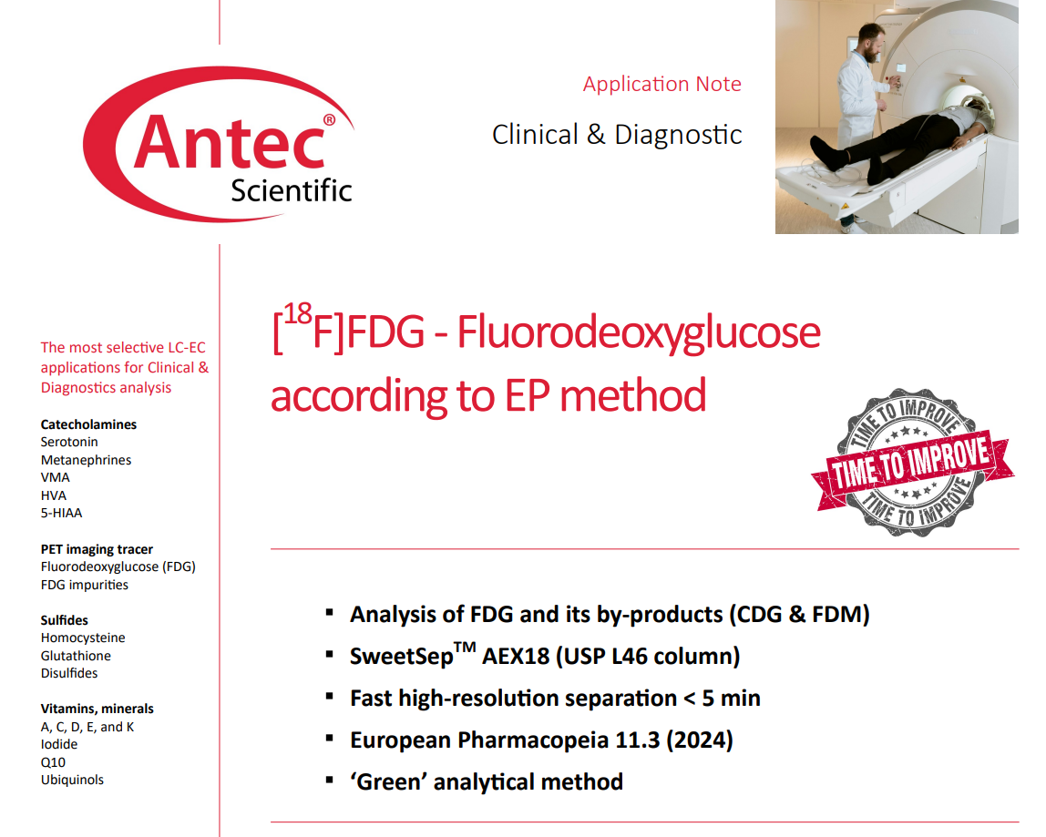 본 어플리케이션 포스터는 뇌 조직에 연결된 In vivo on-line microdialysis을 통해 도파민(DA)과 세로토닌(5-HT)분석법을 시연합니다. DECADE Elite의 넓은 온도 범위를 이용해 높은 온도를 유지할 수 있으며, 이를 통해 약 1분 이내로 도파민과 세로토닌을 분리해낼 수 있습니다. 또한 100 pM 농도의 표준액을 분석해 매우 뛰어난 감도를 얻을 수 있었습니다.