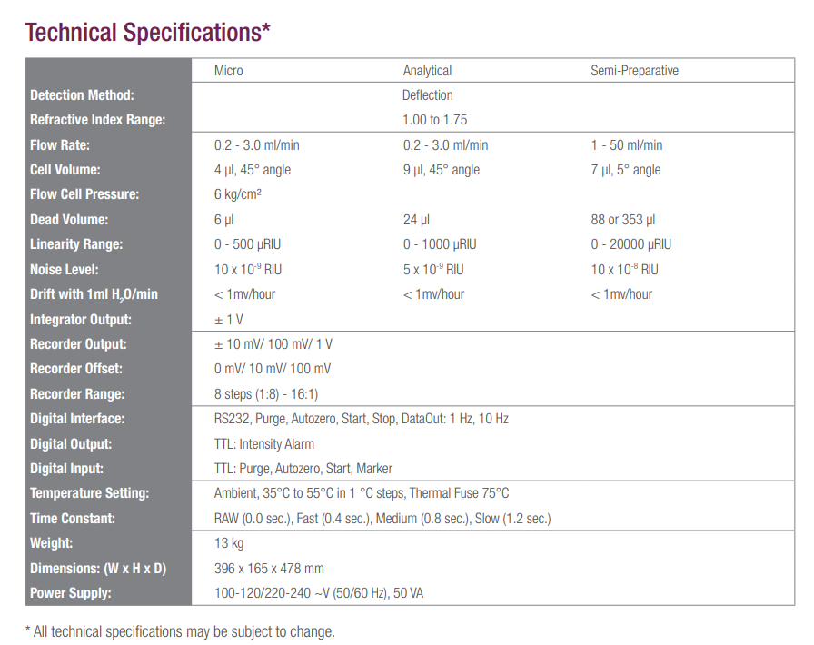 Sykam S 3585 RI Detector는 다음과 같은 장비 규격을 가집니다.