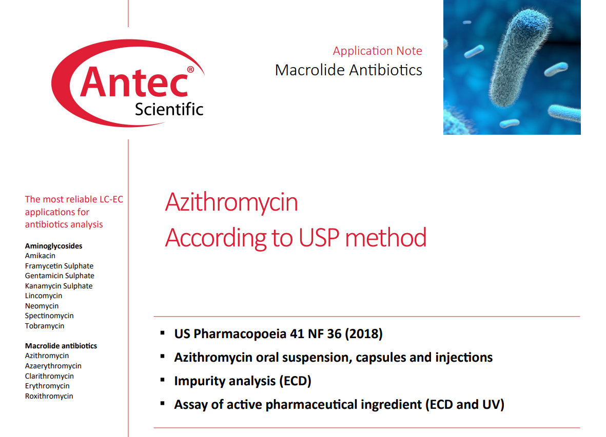 아지트로마이신은 에리트로마이신 및 클라리트로마이신과 화학적 유사성을 가지는 반합성 마크로라이드 계열 항생제입니다. 다양한 그람 양성 세균에 효과적이며 귀, 피부, 폐의 세균 감염 치료에 활용될 수 있습니다. 아지트로마이신의 경우 자외선에 반응하는 발색단과 전기 화학 검출에 반응하는 아민기를 모두 가지고 있기 때문에 HPLC를 통한 분리 후 자외선 흡광도 검출(UVD) 및 전기 화학 검출(ECD)를 모두 사용할 수 있습니다. 아지트로마이신 제제의 활성 의약품 성분(API, Active Pharmaceutical Ingredient) 함량을 측정하기 위한 방법으로 2018년 발간된 미국 약전 41 NF 36 (USP 41-NF36)에서는 LC-E...