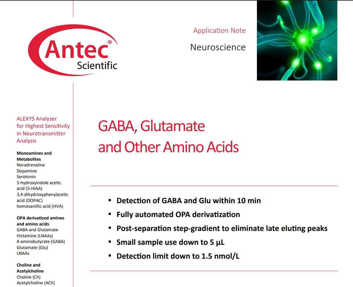 Gamma-Aminobutyric acid(GABA)와 Glutamate(Glu)는 중추신경계에서 가장 중요한 억제성 및 흥분성 신경전달물질입니다. Glutamate는 대표적인 흥분성 신경전달물질로 작용하며, GABA는 신경 흥분성을 조절하는 주요 억제성 신경전달물질입니다. 이들의 농도 변화는 다양한 신경계 질환 및 신경과학 연구에서 핵심적인 바이오마커로 활용됩니다. 본 어플리케이션 노트는 ALEXYS Neurotransmitter Analyzer를 이용한 GABA 및 Glutamate의 고감도 분석 방법을 소개합니다. 두 물질은 전기화학적으로 직접 검출이 어려워 OPA-sulfite 유도체화를 통해 전기화학 활성 형태로 전환한 후 HPLC-전기화학 검출(EC...
