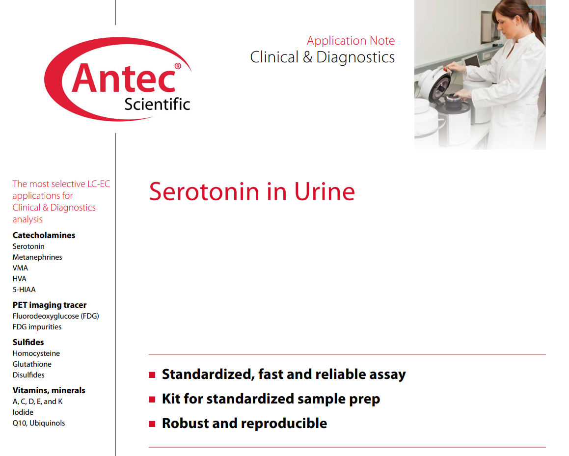 본 어플리케이션 포스터는 뇌 조직에 연결된 In vivo on-line microdialysis을 통해 도파민(DA)과 세로토닌(5-HT)분석법을 시연합니다. DECADE Elite의 넓은 온도 범위를 이용해 높은 온도를 유지할 수 있으며, 이를 통해 약 1분 이내로 도파민과 세로토닌을 분리해낼 수 있습니다. 또한 100 pM 농도의 표준액을 분석해 매우 뛰어난 감도를 얻을 수 있었습니다.