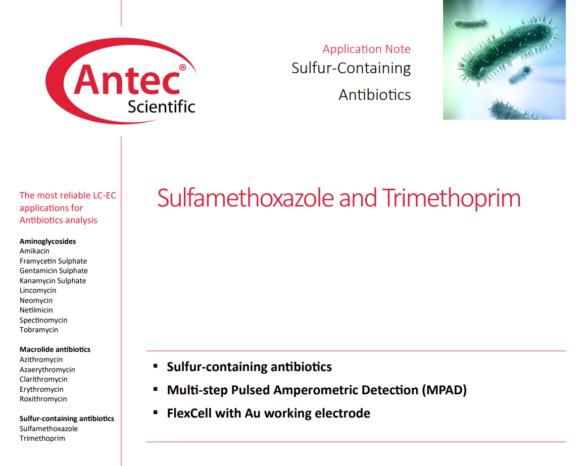 설파메톡사졸(SMX; Sulfamethoxazole)과 트리메토프림(TMP; Trimethoprim)은 복합 항생제 제제(Co-trimoxazole)로 널리 사용되는 항균제입니다. 일반적으로 5:1 비율(SMX:TMP)로 정제에 포함되며, 폐렴, 기관지염, 요로 감염 등 다양한 세균 감염 치료에 사용됩니다. SMX는 설폰아마이드계 항생제로 황(sulfur)기를 포함하고 있으며, TMP는 아미노피리미딘계 항균제로 서로 다른 기전으로 작용하여 상승 효과를 나타냅니다. 본 어플리케이션 노트는 두 성분을 HPLC-PAD 방식으로 분석한 사례를 소개합니다. 특히 황을 포함하는 화합물의 특성을 활용하여 금(Au) 전극 기반 Puls...