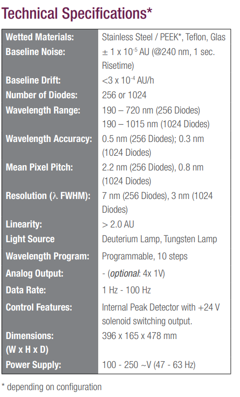 256 혹은 1024 채널을 사용하여 190 - 1019 nm 파장 범위의 흡광도를 측정하며 이중 관심있는 최대 4개의 파장을 선택해 데이터 기록을 할 수 있습니다.